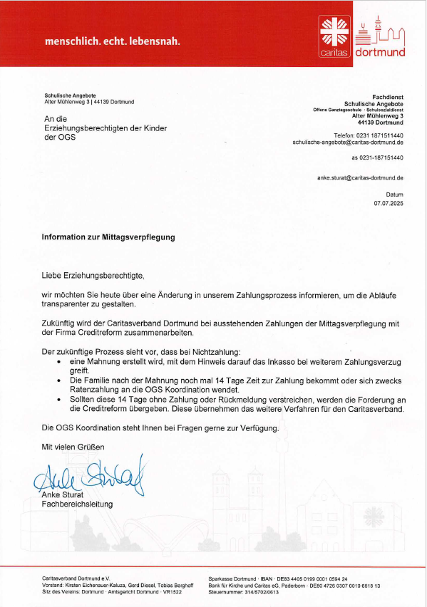 Der folgende Link beinhaltet das Anschreiben der Träger der Offenen Ganztagsschulen in Dortmund bzgl. der Erhöhung der Essensbeiträge:
